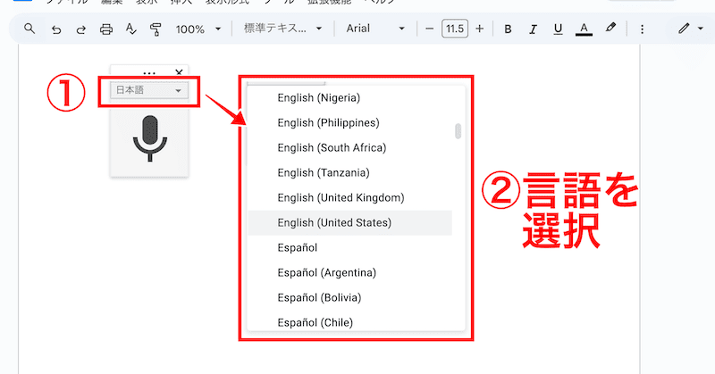 なお、言語の設定は、マイクのアイコン上部から行えます。Googleドキュメントは、各地の英語や中国語、韓国語など100以上の言語に対応しています。