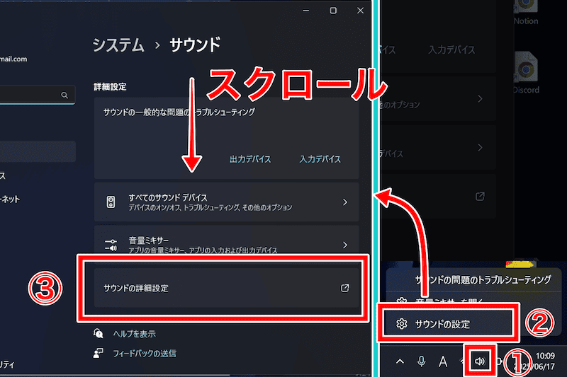 1−1.画面右下のスピーカーを右クリックし、「サウンドの設定」を開く。下へスクロールし「サウンドの詳細設定」を開く