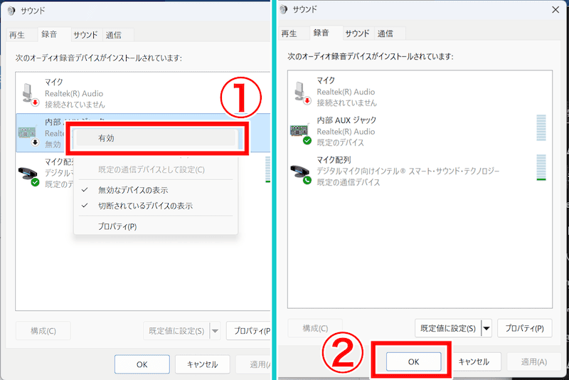 1−2.「録音」タブ内の「ステレオミキサー」または「内部AUXジャック」を右クリックして「有効化」を選択(自動的に「既定のデバイスとして設定」される)