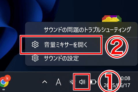 2−1.画面右下のスピーカーを右クリックし、「音量ミキサーを開く」をクリック