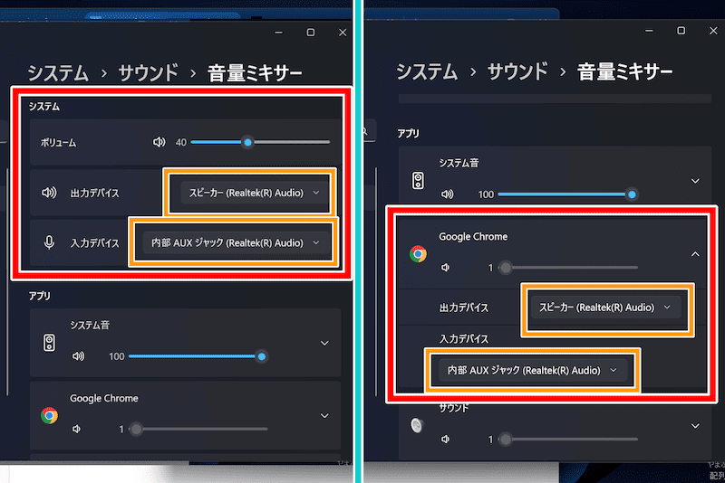 2−2.「システム」内の出力デバイスを「スピーカー(Realtek(R) Audio)」、入力デバイスを「内部AUXジャック(Realtek(R) Audio)」または「ステレオミキサー(Realtek(R) Audio)」に設定。