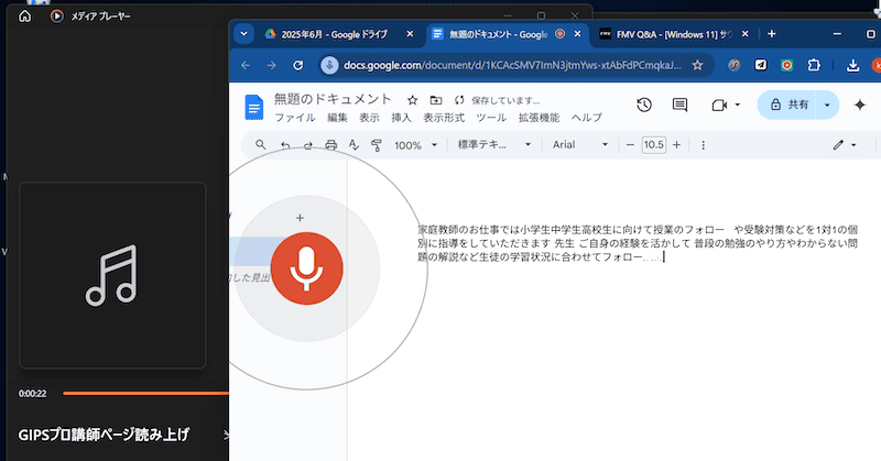 メディアプレーヤーなどで音声を再生し、Googleドキュメントの音声入力をONにすると文字起こしが始まります。別のウインドウに移動すると音声入力が切れてしまうため、必ず再生開始→マイクONの順番です。文字起こしが終わるまで、Googleドキュメントを開いたまま見守りましょう。