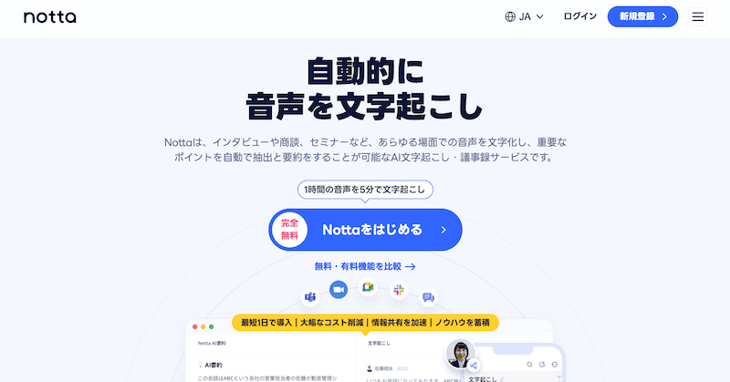 nottaは、AIを活用した高機能な音声文字起こしサービスです。会議やインタビューの音声をリアルタイムで文字起こしできるほか、音声・動画ファイルも対象としており、1時間の音声なら約5分で文字起こしできます。モバイルアプリもあり、場面に応じて利用可能です。