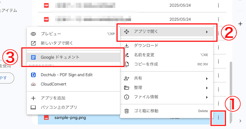 ファイルをGoogleドキュメントで開くには、アップロード後に操作メニューを開き、「アプリで開く」>「Googleドキュメント」の順に選択します。