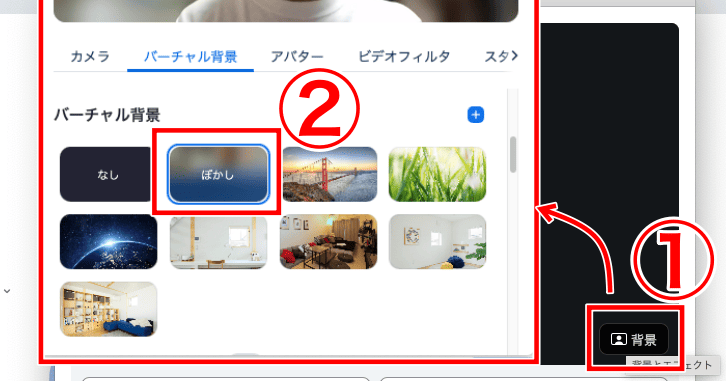 - バーチャル背景のタブで「ぼかし」を選択