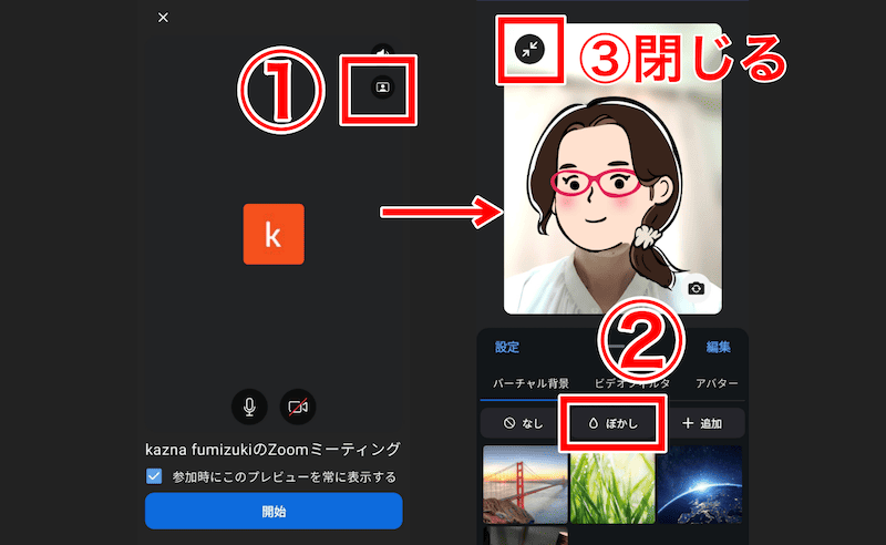 ミーティング開始時に背景ぼかしを設定する手順|スマホ