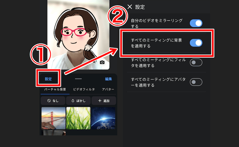 - 「すべてのミーティングに背景を適用する」をオンにする