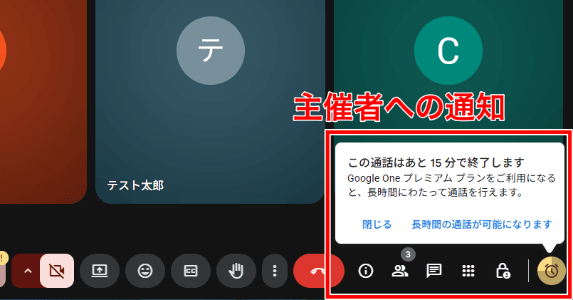 終了時間が近づくと、主催者および参加者全員に、間もなく会議が終了する旨の通知が表示されます。通知が来るタイミングは、終了5分前や10分前との情報もありますが、筆者が試した際は15分前でした。Google側で細かなアップデートを行っている様子がうかがえます。
