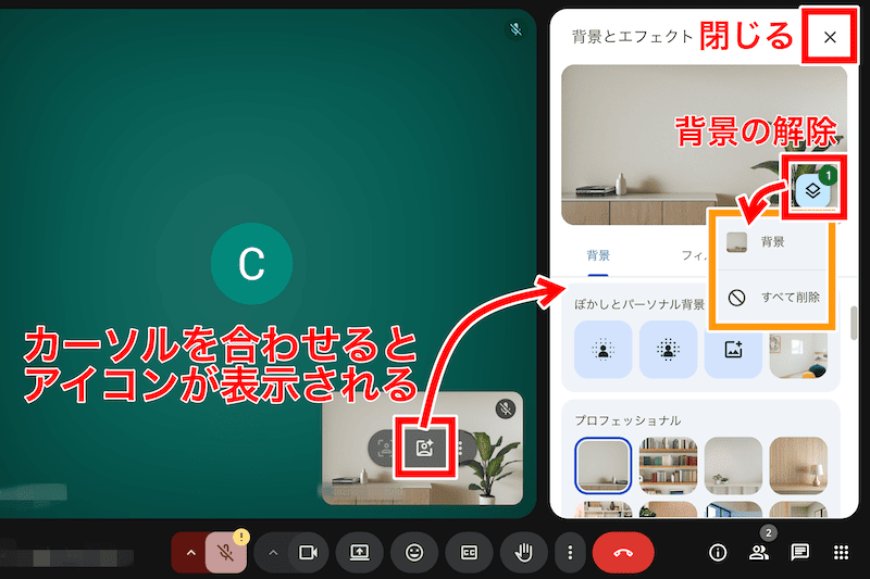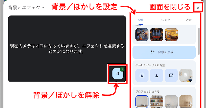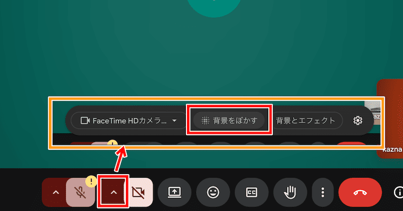 - ビデオアイコンの横の「∧」マークから「背景とエフェクト」をクリックする