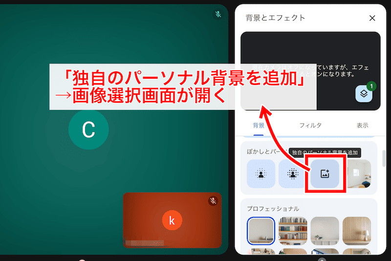 - ぼかしとパーソナル背景:背景をぼかす、オリジナル背景を追加する