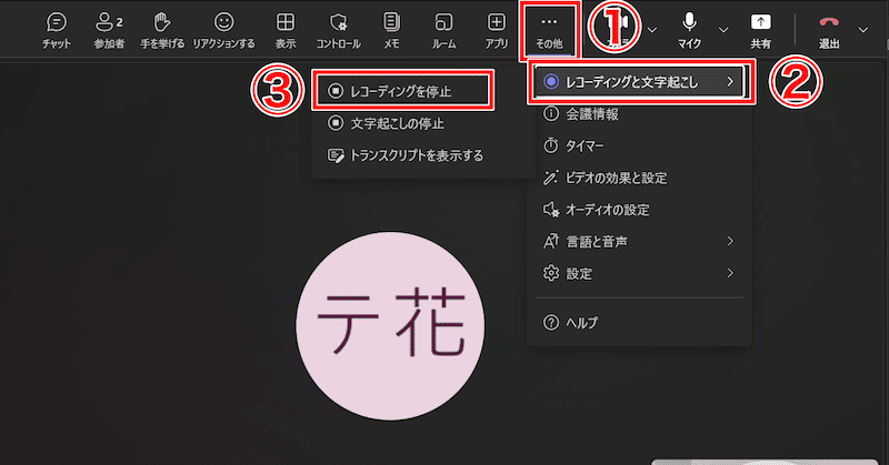 手動で録画を停止する場合は、「その他」メニューから「レコーディングを停止」をクリックしてください。確認ダイアログで「停止」をクリックすれば録画が止まります。録画の停止操作は、開始した方とは別の方でも可能です。