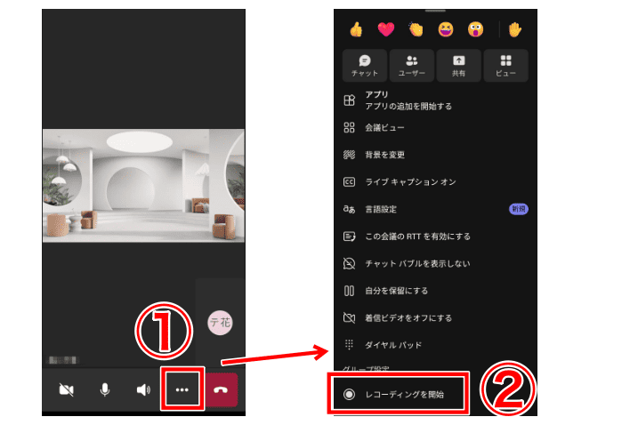 スマホアプリでTeams会議を録画するには、以下のように操作します。