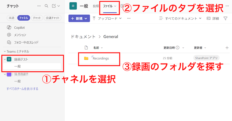 チャネル内で行われた会議の場合、録画データは該当チームのSharePointに保存されます。チャネルの「ファイル」タブから探すことができ、チームメンバーであればアクセス可能です。