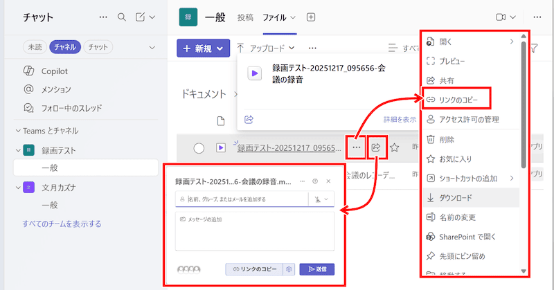 録画一覧の画面からは、メッセージを付けてのリンク共有も簡単です。以下はチャネル内の録画一覧です。目的の録画にカーソルを合わせ、「共有」アイコンをクリックするとメッセージを入力する欄が現れます。また、3点メニューをクリックすると、リンクのコピーやアクセス許可の管理といった操作が行えます。