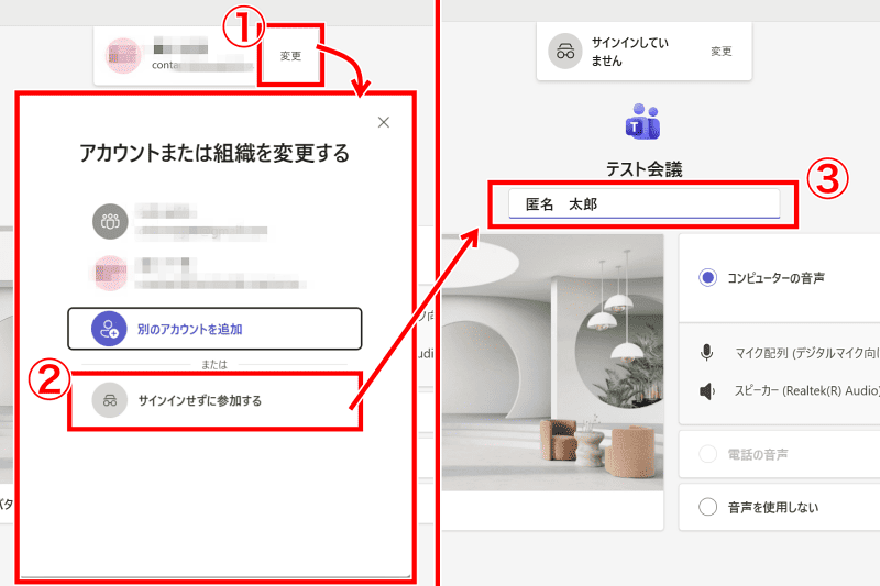 Teamsアプリの場合は、入室前の画面でアカウント名の横の「変更」ボタンを押すと、「サインインせずに参加する」オプションが選択できます。選択すると名前の入力画面が現れ、名前変更して会議に参加できます。