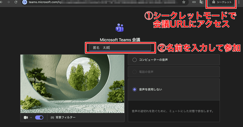 サインインせずに匿名で会議に参加すると、入室時に一時的な名前を入力できます。会議の設定でサインインしていないユーザーの参加(匿名参加)が許可されている場合に使える方法です。