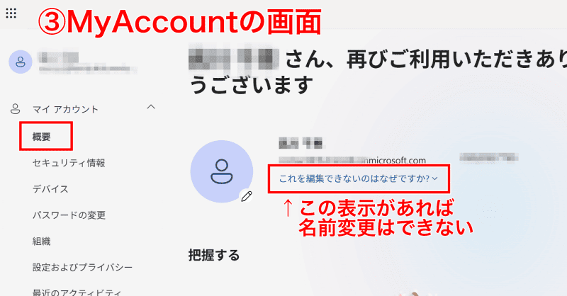 MyAccount(マイアカウント)で「これを編集できないのはなぜですか?」の表示が出ていれば、自分で表示名を編集する権限はなく、管理者に依頼しなければなりません。具体的な申請方法は組織ごとに異なるため、担当部署へ確認してみましょう。
