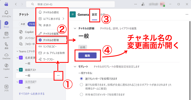 チャネルの名前は、チームまたはチャネルの所有者が変更できます。なお、チーム内で最も重要なチャネルである「一般」(または「General」)チャネルは、チームの所有者のみが名前を変更できます。