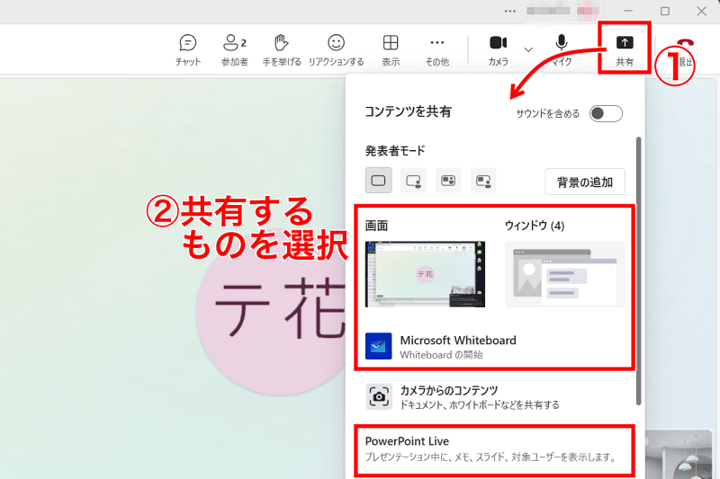 Teamsの画面共有操作は簡単です。以下の操作により、選択したコンテンツが即座に共有開始されます。