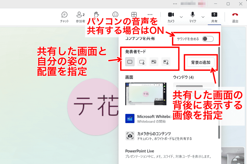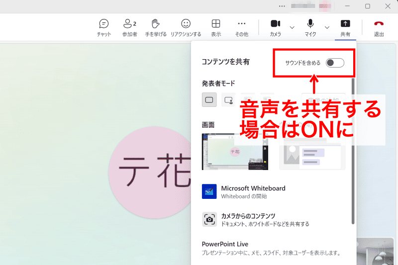 動画などの音声も共有したい場合は「サウンドを含める」をONにしておきましょう。パソコン内の音声が、マイクを介さず直接送信されます。設定を忘れた場合は、ツールバーから「サウンドの共有」をONにすると共有できます。