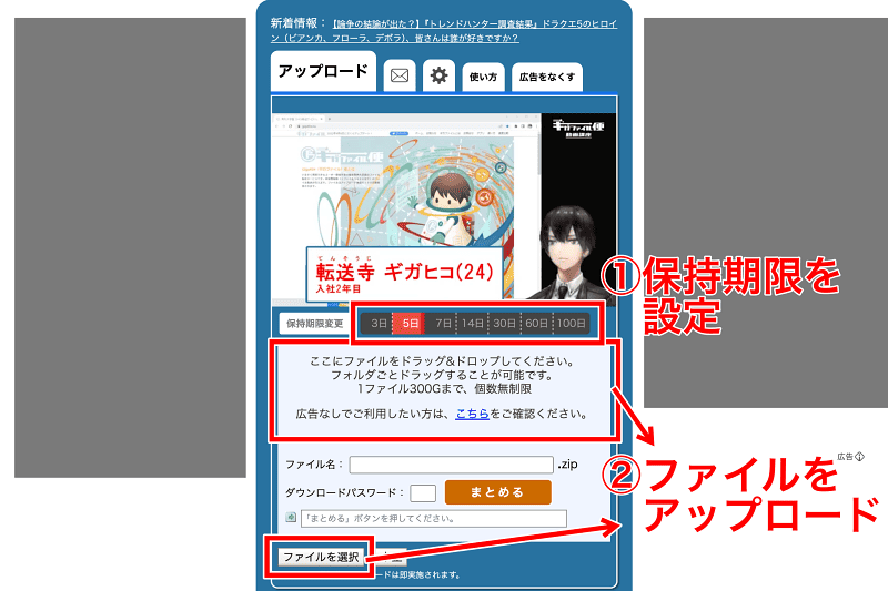 公式サイトのトップページを下へスクロールするとアップロードエリアがあります。ファイルの保持期限は、初期設定として「5日」が選択されていますが、3日・5日・7日・14日・30日・60日・100日から選択できます。