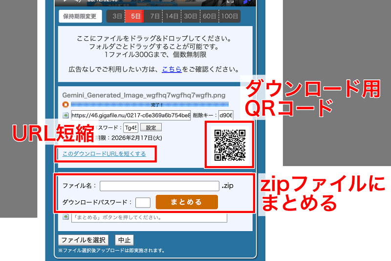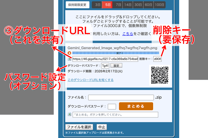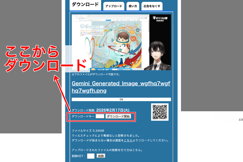削除キーも控えておきましょう。ファイルの削除はダウンロード画面から行えます。