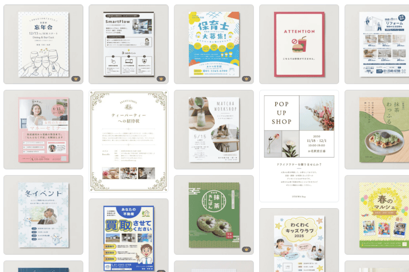 店舗の販促チラシ、社内イベントのポスター、サークルや学園祭のチラシといった印刷物の作成もCanvaで行えます。テンプレートを選んで文字や画像を差し替えるだけで、プロが作ったようなデザインが完成します。もちろん自分で用意した画像を使うことも可能です。