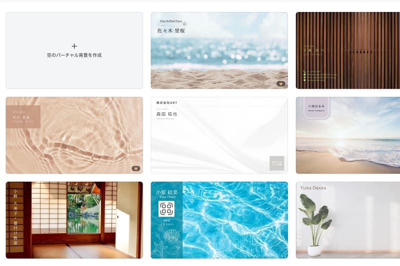 社内会議、オンライン授業、イベント配信などで使えるバーチャル背景も作成できます。適したサイズのテンプレートが多数あり、好きなものを選んで使用できます。
