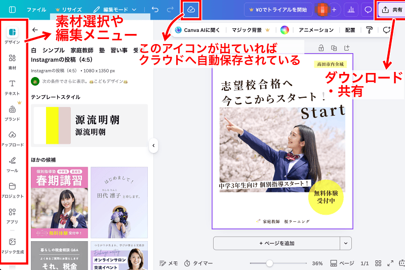 はい、無料プランでも十分に使えます。基本的なデザイン作成に必要なテンプレートや素材、編集機能はすべてそろっています。完成したデザインのダウンロードや書き出しも行えます。